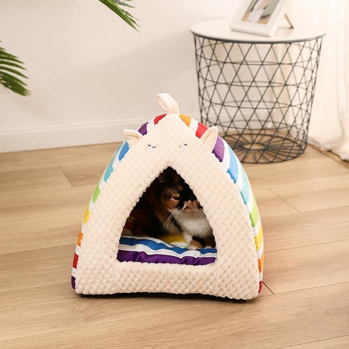 This rainbow pet bed is so cozy and comfy that your dog and cat will fall asleep immediately! Made of breathable cotton material, it is perfect for all year round! Available in two sizes. ☀️