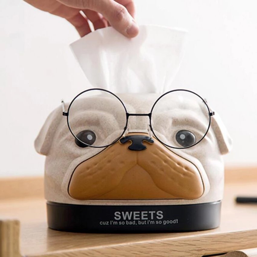 Look at this Cute Pug Face Tissue Paper Box! Funny yet cute design that will make a great decoration at your home or office! Available in 4 pretty colors!