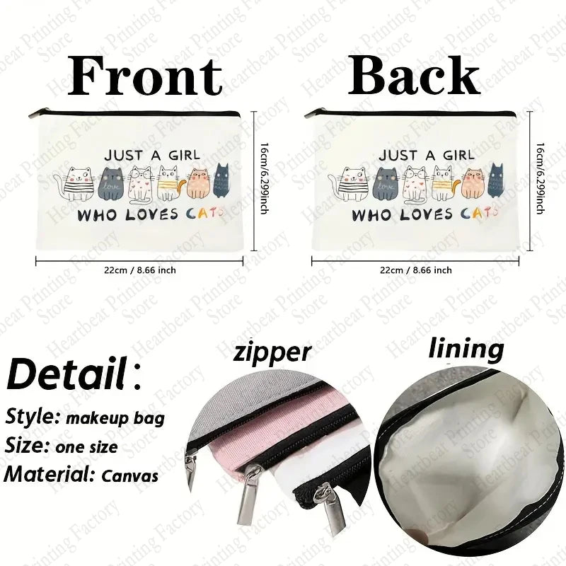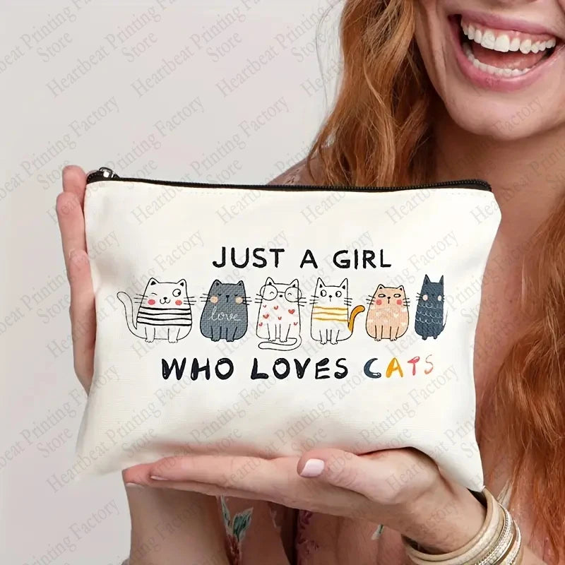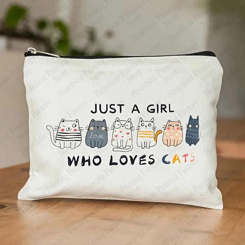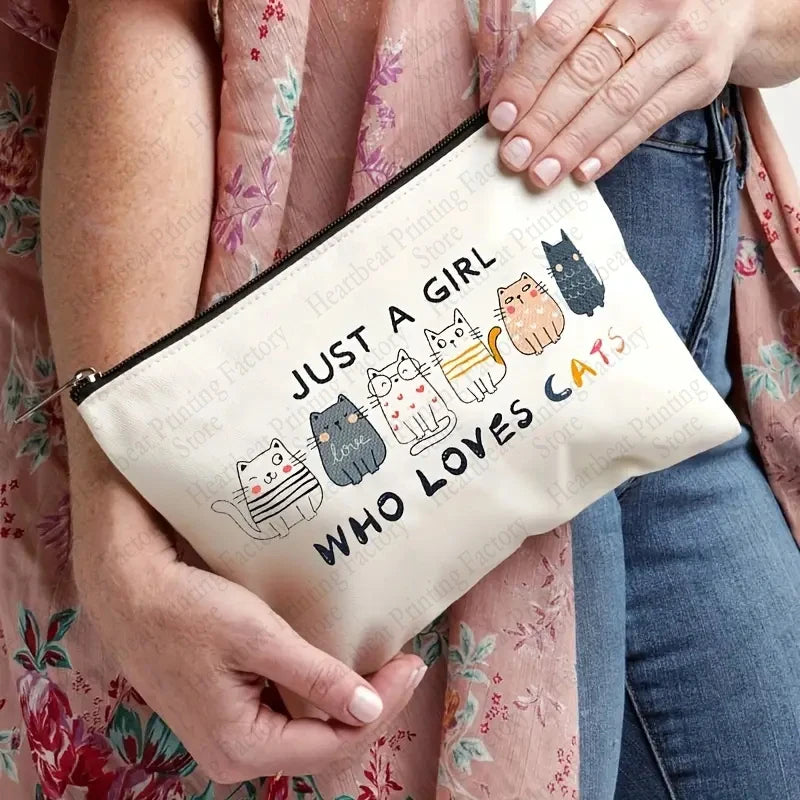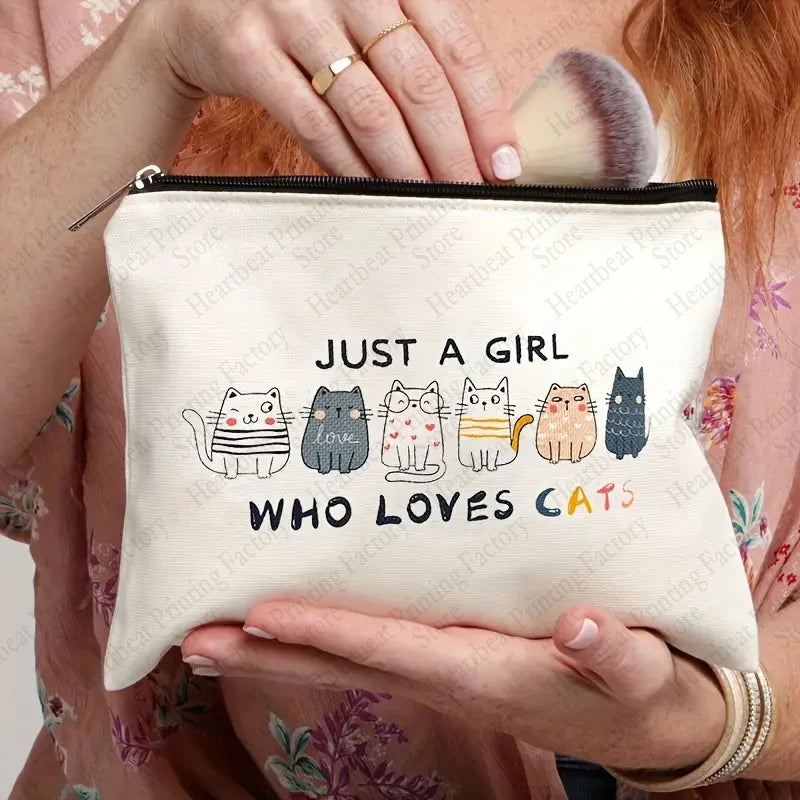 Printed with a playful row of illustrated cats and the phrase “Just a Girl Who Loves Cats”, it’s the ideal accessory for cat lovers who like to stay organized in style. Whether used for makeup, travel essentials, or daily items, this bag adds personality and functionality to any routine.
