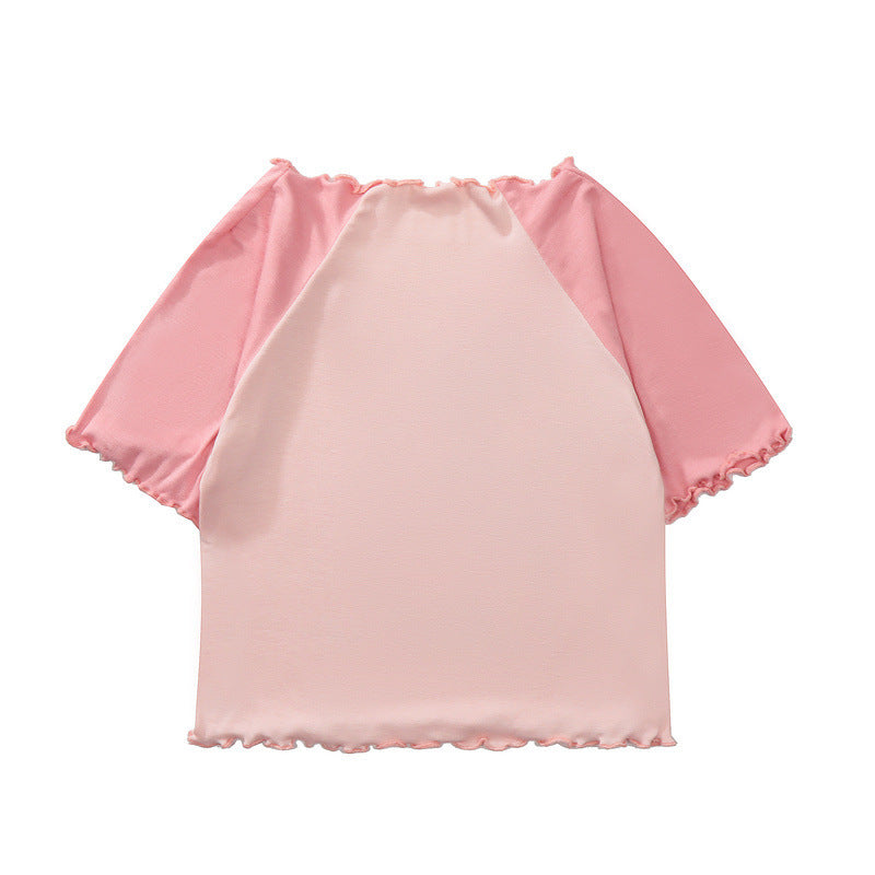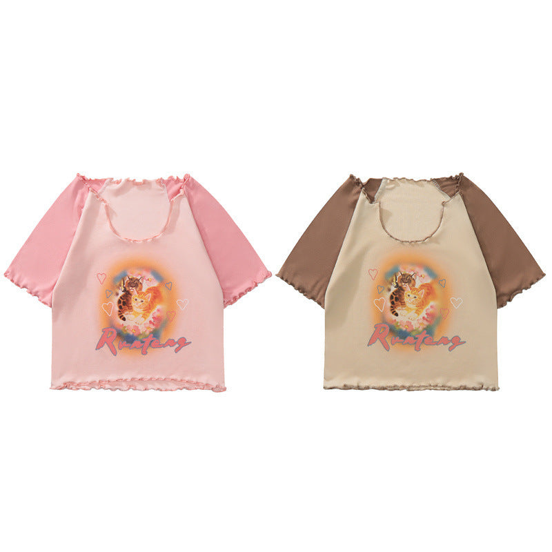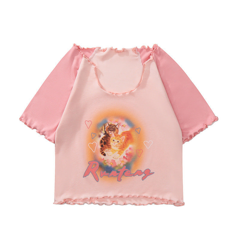 Designed with soft pastel tones, frilly trim, and an adorable kitten print, this top blends early-2000s charm with modern comfort. A must-have for anyone building a trendy, aesthetic wardrobe or diving into the coquette and soft girl fashion scene.